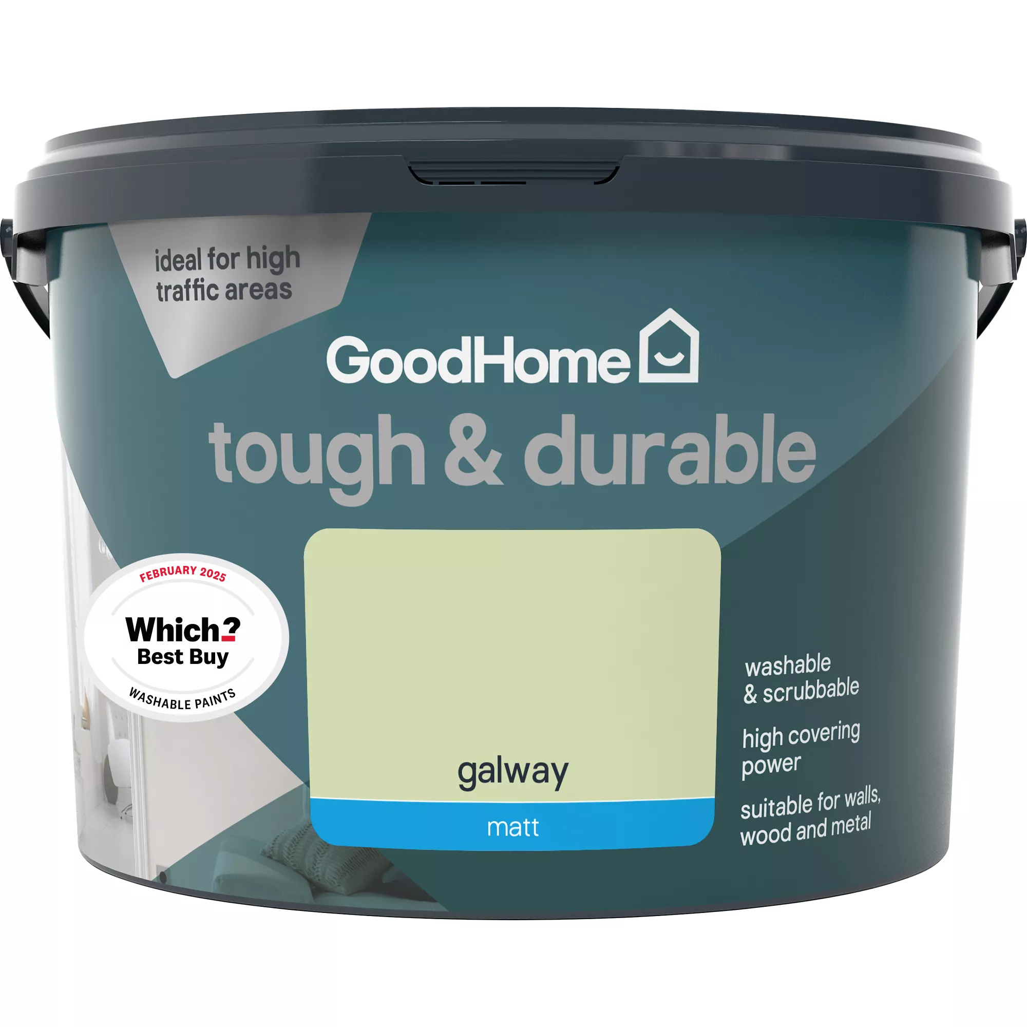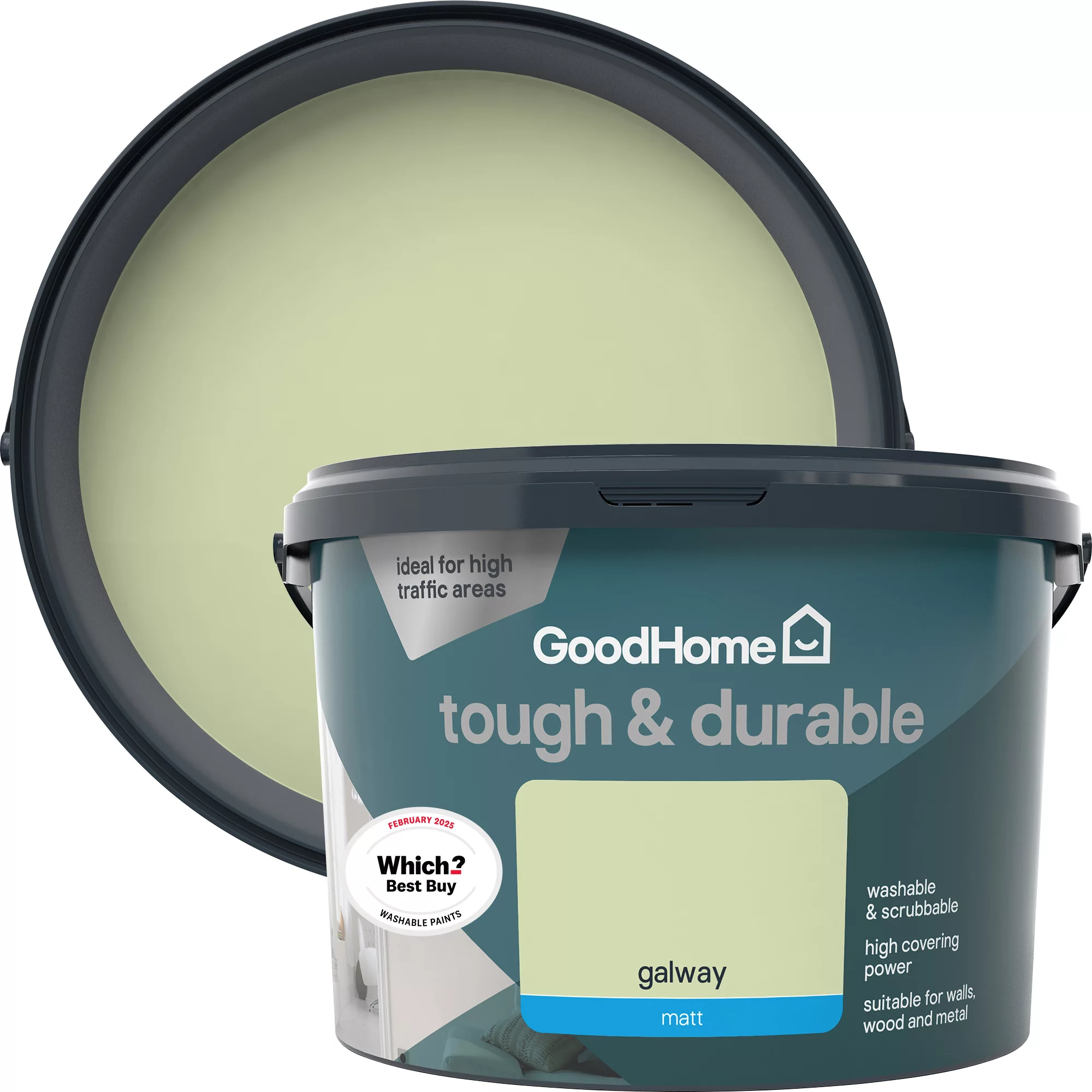 GoodHome walls and ceilings durable paint is suitable for walls, wood and metal with our toughest formulation and excellent covering power. It is extremely hard wearing so is ideal for hallways, stairwells and children’s bedrooms.